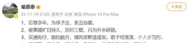 11月19日晚,演员喻恩泰在其个人社媒发文回应近期离婚风波:1,忍辱多年。为孩子念,家丑自匿。2,被离婚旷日持久,历时三载,只为升米碎银。3,买通狗仔,跟拍数月,捕风捉影造谣言。君子坦荡荡,小人必现形。4,已报警,已立案,有法律,有正义。微博升堂断案,可休矣。